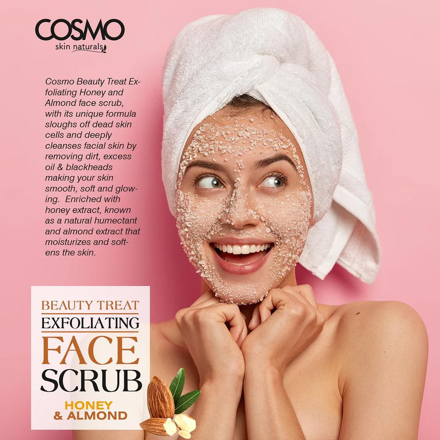 Experience a radiant and smoother complexion with Cosmo Beauty Treat Exfoliating Honey and Almond Face Scrub. This intense formula combines the nourishing properties of honey and the gentle exfoliation of crushed almonds to reveal fresh, glowing skin. The scrub effectively removes dead skin cells, dirt, excess oil, and blackheads without causing irritation. Honey, known for its antiseptic, antioxidant, and antibacterial benefits, helps purify and heal the skin, while almond extract moisturizes and softens. This unique formula leaves your skin feeling clean, nourished, and silky-smooth.